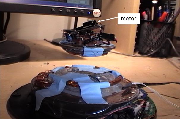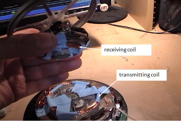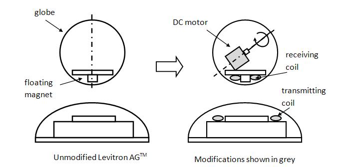 La bobina del receptor es un circuito paralelo LC (~2.5 nF y ~60 vueltas). Está conectado a un rectificador puente. El motor DC (hecho de un micro servo, modificado para rotar continuamente) está alimentado por un acoplamiento inductivo resonante. La bobina receptora,los componentes eléctricos, y el motor inclinado están fijados en la base flotante. Sus ubicaciones son ajustadas para mantener el centro de gravedad. La cubierta externa del globo está conectada directamente al eje del motor.