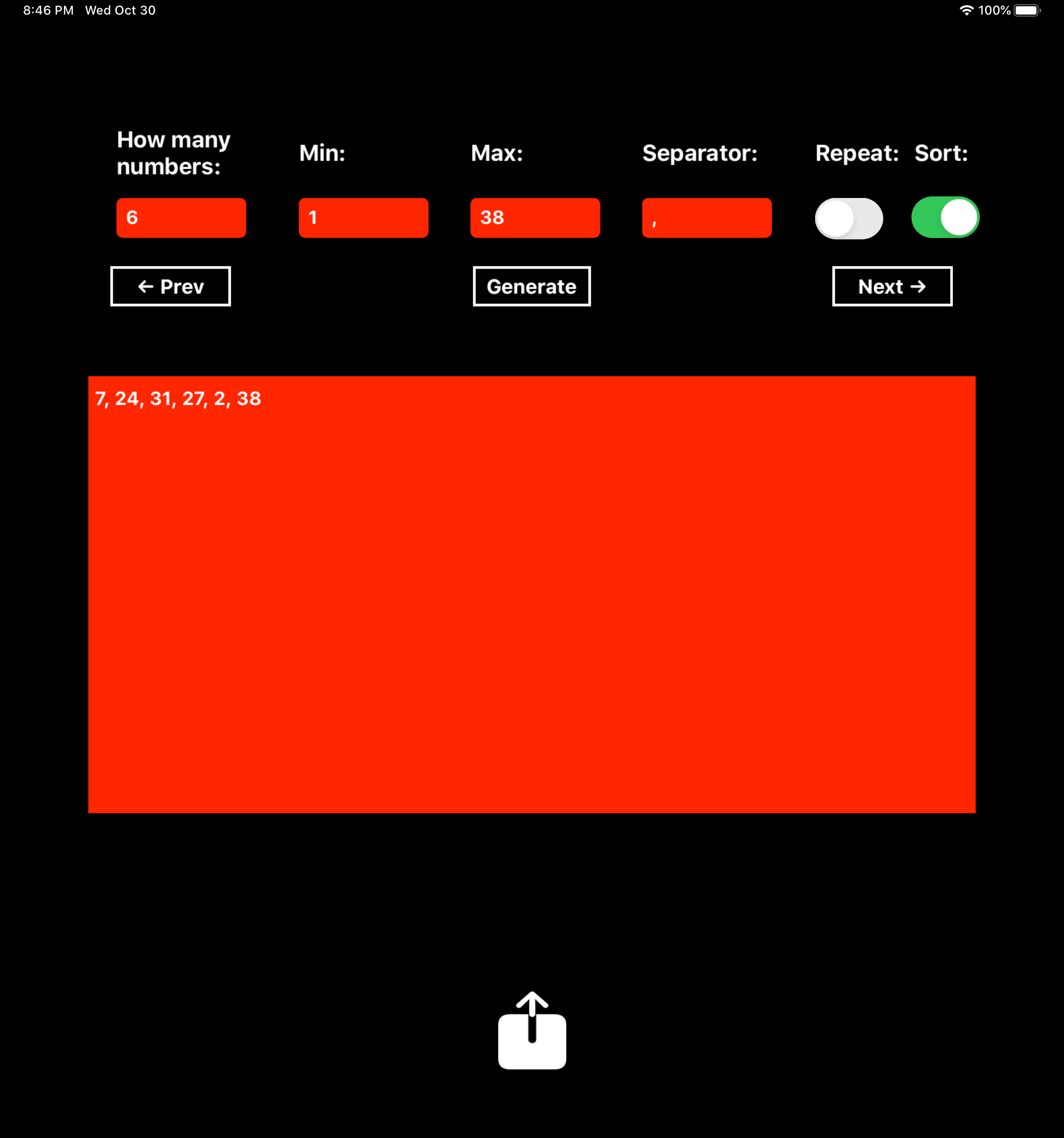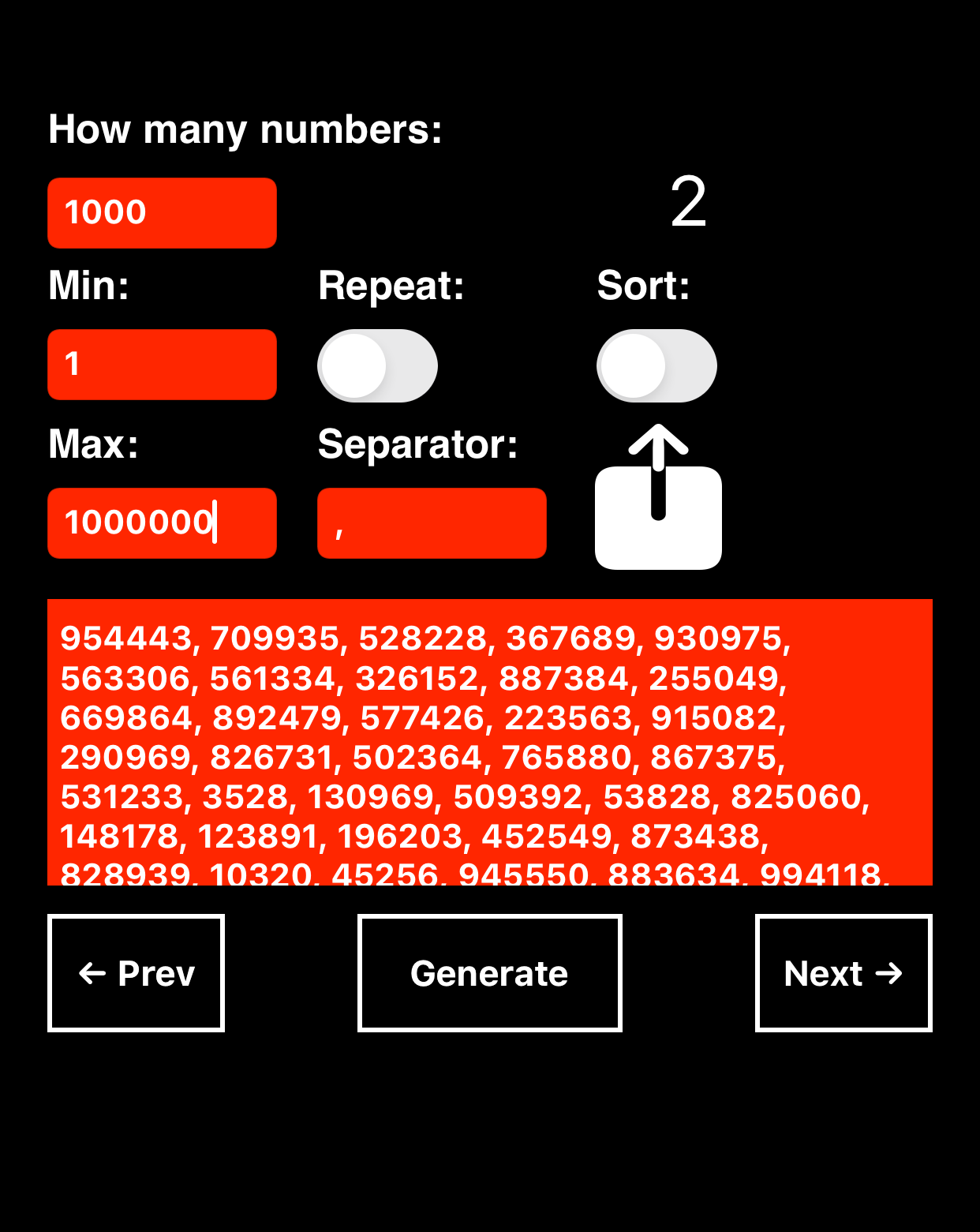 – If you tap «Generate» several times, the previous generated numbers are stored in memory and you can review the different results by tapping the «Prev» and «Next» buttons.