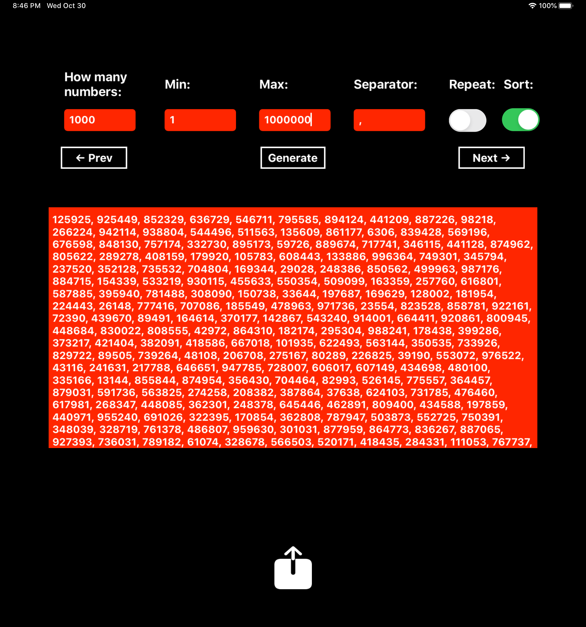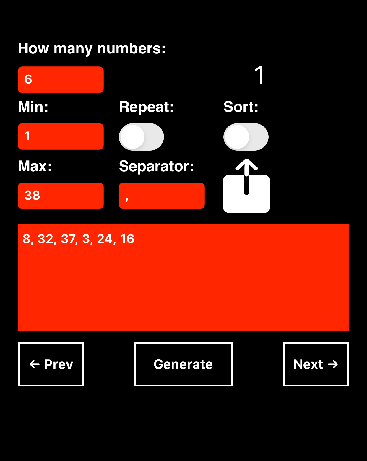 – If you tap «Generate» several times, the previous generated numbers are stored in memory and you can review the different results by tapping the «Prev» and «Next» buttons.